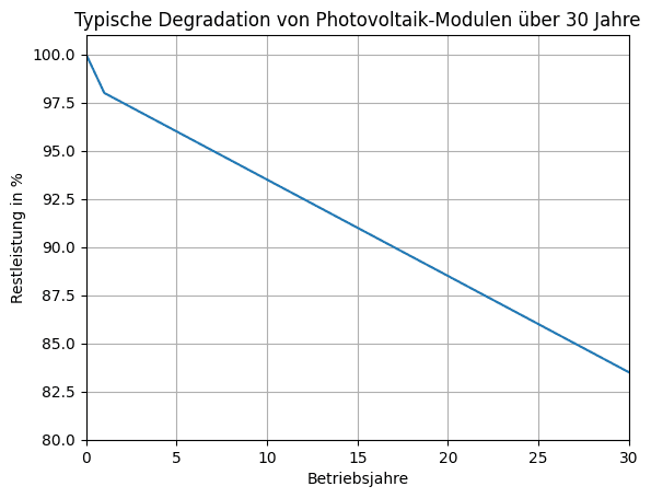 Wie stark sich die Leistung einer Photovoltaikanlage im Laufe der Zeit verändert, lässt sich anhand typischer Restleistungswerte darstellen. Die folgende Tabelle zeigt, mit welcher verbleibenden Leistung bei Qualitätsmodulen nach 1, 10, 20 und 30 Jahren üblicherweise gerechnet werden kann. Die Werte sind Durchschnittsbereiche und können je nach Modultechnologie und Hersteller leicht variieren.