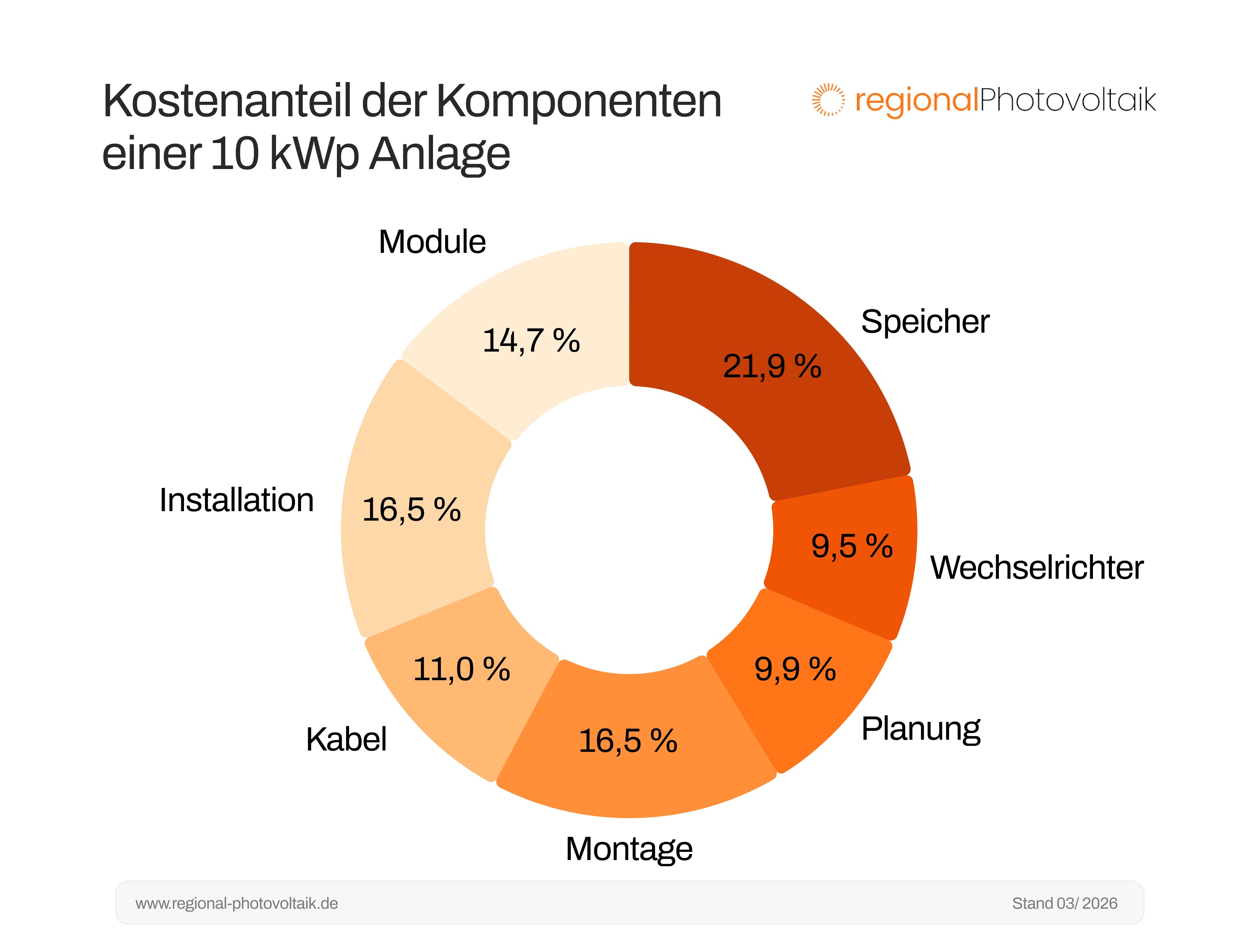 Die wichtigsten Kostenfaktoren einer 10 kWp Anlage sind Module, Speicher, Wechselrichter, Montage und Installation.