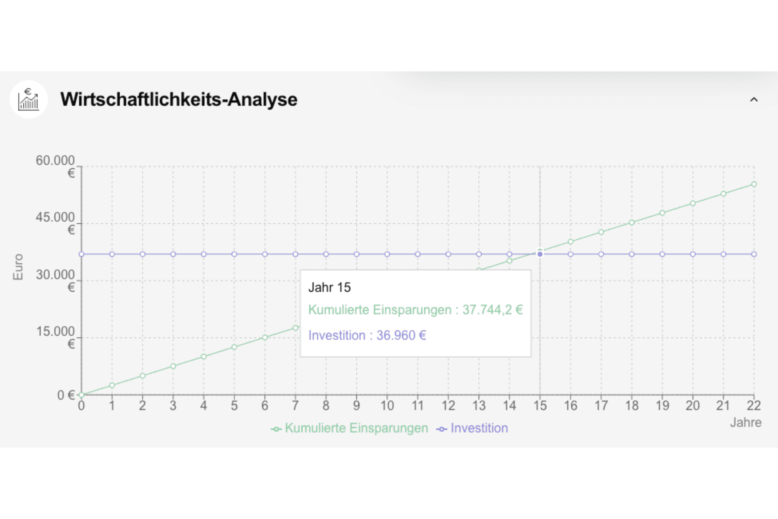 Nach knapp 14,8 Jahren ist die Anlage abbezahlt – ab dann erwirtschaftet sie Gewinne. Grafik stammt aus unserem Amortisationsrechner.