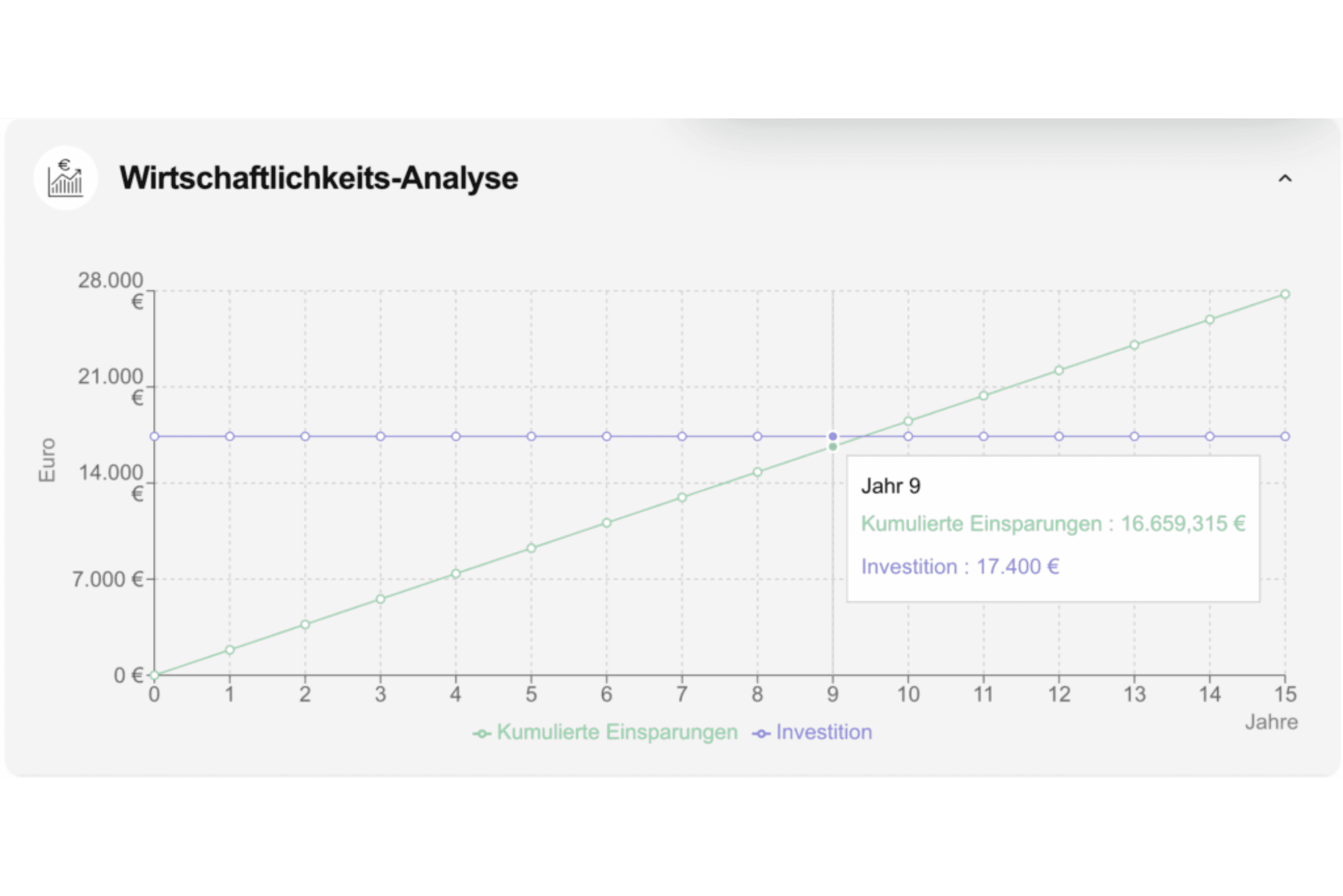 Die folgende Beispielrechnung verdeutlicht die Wirtschaftlichkeit einer 9 kWp-Anlage mit Speicher. Für eine individuelle Berechnung steht Ihnen unser Amortisationsrechner zur Verfügung.